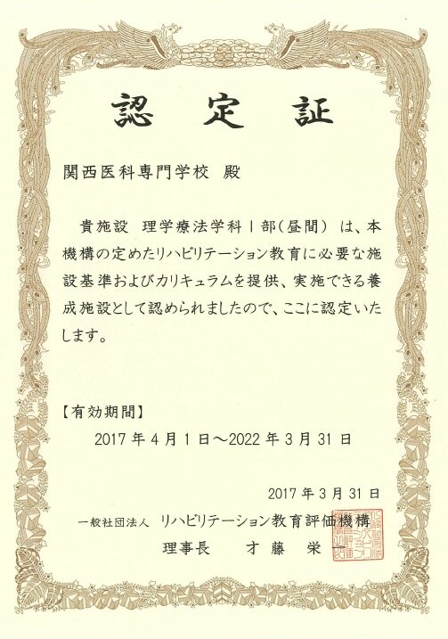 TOPICS オープンキャンパス 6/1~AO入試エントリー受付開始 動画で見るキャンパスライフ 関西医科専門学校6つの特色 1国家試験合格まで徹底サポート 2関西最大級の入学定員「I部80名」 「II部40名」 31年次からの早期臨床実習やチューター制でやる気をサポート 4校舎は8階建ての専用校舎充実の施設・設備 5学びたい気持ちに応える奨学金制度 6最寄駅から徒歩すぐの抜群アクセス COURSE 理学療法学科I部 理学療法学科I部 3年制 理学療法学科II部 理学療法学科II部 4年制 NEWS 2025-10-15お知らせ 公式サイトのメンテナンス(閲覧不可日時10/17)のお知らせ 2025-09-04お知らせ 医科 9/5(金)台風接近に伴う授業の取り扱いについて 2025-07-19お知らせ 医科2025年度 夏期休暇中の事務の取扱いについて(お知らせ) 2025-04-08イベント 理学療法体験セミナー開催!※どなたでも参加可能 2025-03-27入試 2026年4月入学のAO入試ネットエントリー 2024-11-30イベント 【2025年4月入学間に合う】まずはお気軽にお電話を!★キャンパス見学(学校見学・個別相談)受付中★電話相談のみも可 2024-11-28お知らせ 医科 2024年度 冬期休暇中の事務の取扱いについて(お知らせ) 2024-08-29入試 8月31日(土)入試の中止について【8/29 13:00掲載】関西医科専門学校 2024-07-12お知らせ 医科2024年度 夏期休暇中の事務の取扱いについて(お知らせ) 2024-02-19お知らせ 3月平日開催オープンキャンパスについて(お知らせ) 2023-12-13お知らせ 医科 2023年度 冬期休暇中の事務の取扱いについて(お知らせ) 2023-10-18お知らせ 【メディア掲載】WEBサイト「転職hub」に掲載されました 2023-07-10お知らせ 医科2023年度 夏期休暇中の事務の取扱いについて(お知らせ) 2023-05-06お知らせ 2023年5月8日以降の授業等の実施方針について 2023-03-27実習先の方へ 【臨床実習指導者向け】2023年度臨床教育者会議議事録と臨床実習指導要項について 2023-02-24実習先の方へ 【臨床実習指導者向け】2023年度 臨床教育者会議・臨床実習指導要項について 2022-12-24お知らせ 医科 2022年度 冬期休暇中の事務の取扱いについて(お知らせ) 2022-12-21入試 2023年度入試 理学療法学科Ⅰ部(昼間)募集終了について 2022-07-28お知らせ 医科 2022年度 夏期休暇中の事務の取扱いについて(お知らせ) 2022-02-24お知らせ 【臨床実習指導者向け】2022年度 臨床教育者会議・臨床実習指導要項について 2022-01-17お知らせ 2022年度 臨床教育者会議について(お知らせ) 2021-12-27お知らせ 医科 2021年度 冬期休暇中の事務の取扱いについて(お知らせ) 2021-09-17イベント 9/18開催オープンキャンパスの実施について 2021-09-14お知らせ 緊急事態措置の延長に伴う本校の対応について(遠隔授業期間の9/30まで延長) 2021-08-31お知らせ 緊急事態措置の延長に伴う本校の対応について(~9/12) 2021-08-02お知らせ 緊急事態措置に伴う本校の対応について(8/2~8/31) 2021-06-19お知らせ 緊急事態宣言解除に伴う本校の対応について(6/21~対面授業の再開) 2021-06-01お知らせ 緊急事態措置の延長に伴う本校の対応について(遠隔授業期間の6/20まで延長) 2021-05-08お知らせ 緊急事態措置の延長に伴う本校の対応について(遠隔授業期間の5/31まで延長) 2021-04-28お知らせ 緊急事態措置に基づく本校の対応について(遠隔授業期間の5/11まで延長) 2021-04-17お知らせ 2021年4月19日(月)から5月5日(水)の授業について 2021-01-16お知らせ 【理学療法学科】Vlog(Video Blog)更新!2021/1/16 2020-11-30お知らせ 【理学療法学科】講義動画(整形外科的テスト)更新!2020/11/30 2020-10-15入試 2021年度 理学療法学科Ⅰ部(昼間)募集終了について 2020-10-05お知らせ 【理学療法学科】オンラインオープンキャンパス 2020-04-08お知らせ 【理学療法学科】講義動画(オンライン学習用)を公開しました! 2017-04-01お知らせ リハビリテーション教育評価機構の養成施設に認定されました。(2022.4.1更新) ALL NEWS
